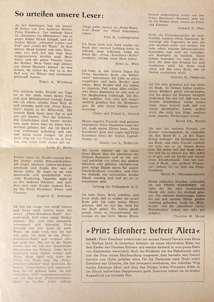 Ab 1953 erschienen hier im jährlichen Abstand (genauer: Band 1 und 2 erschienen 1953; Band 3 in 1955, danach jährlich bis Band 11 in 1963) die Abenteuer von Prinz Eisenherz in der erweiterten Textfassung von Max Trell, in der deutschen Bearbeitung von Dr. Paul Eitel-Deppe. In den Prosatext sind s/w-Bilder des Originalcomics eingebettet.