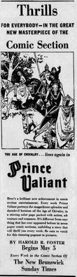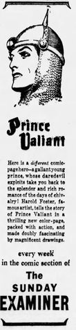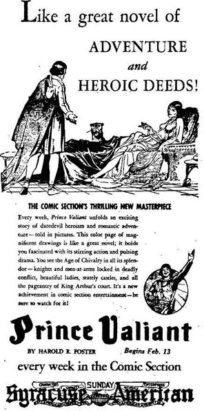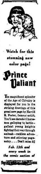 Die Tageszeitung »The Democrat and Chronicle« aus Rochester, New York, veröffentlichte bereits sehr früh die „full pages“ von Prince Valiant (PV). Diese hier gezeigte Anzeige datiert vom 29. Juli 1937 und kündet den Start von PV in der Comic-Rubrik der nächsten Sonntagsausgabe am 1. August 1937 an. Das gezeigte Bild ist das erste Panel von Sonntagsseite #2.