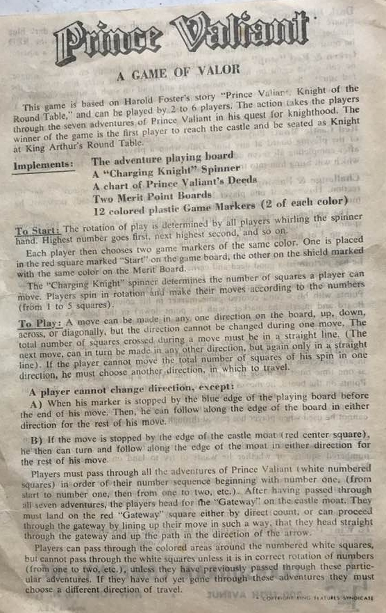 ZWECK DES SPIELS: Das Abenteuerspiel, das auf der Geschichte von Harold Foster „PRINZ EISENHERZ, RITTER DER TAFELRUNDE“ basiert, führt den Spieler durch die sieben ritterlichen Abenteuer von Prinz Eisenherz auf seiner Suche nach dem Rittertum. Durch das Abschließen eines Abenteuers erhält jeder Spieler Verdienstpunkte, die auf der Tatentabelle des Prinzen Eisenherz aufgeführt sind. Der Gewinner ist der erste Spieler, der seine sieben Abenteuer in der richtigen Reihenfolge beendet, das Burgtor betritt, den Burggraben umrundet, die Burg betritt und als Ritter an der Tafelrunde von König Artus Platz nimmt.